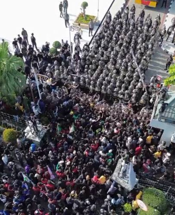 Namun situasi mendadak berubah tegang saat sebagian massa yang masih bertahan di depan kantor gubernur mulai melakukan pelemparan batu, botol air, dan benda lainnya ke arah area kantor.